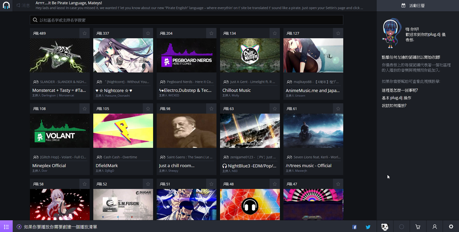 很簡單的進入「 Plug.dj 」後,可以在主畫面上看到各式各樣愛好者建立的音樂實況房間,在「 Plug.dj 」中稱呼為「社區」。