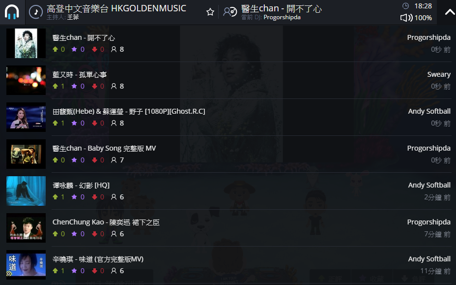 在派對房間的右上方,我們可以找到這個主題社區最近播放過的所有歌曲,以及房間裡每個使用者對這首歌的評價。